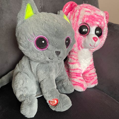 Ty My Little Pony kosedyr i form av en svart og hvit hund med blå detaljer og sløyfe, samt en grå og hvit katt med rosa nese og øyne. Laget av mykt materiale, egnet for barn. Det er mulighet å kjøpe en hvis man vil. 200 kroner per bamse.
