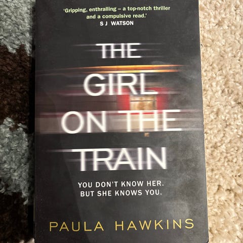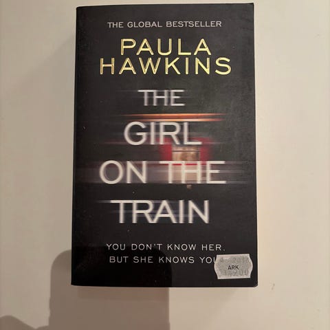 Paula Hawkins The Girl on the Train er en bok i pocketformat. Den har svart omslag med tittel og forfatternavn i hvit og gul tekst. Boken er en thriller som følger en kvinnes observasjoner på pendeltoget og passer perfekt nå til høsten!
