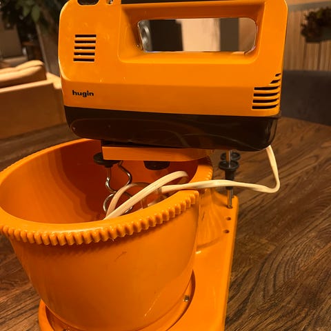 Liker du retrostilen er denne miksmasteren fra 60/70 tallet veldig kul. Den fungerer som den skal, men mangler plastbeholderen til de 2 settene med visper som følger med. Vedlagt i annonse er bilde fra digitalt museum som setter alder til 1965-1970 og høyde til 31cm.
