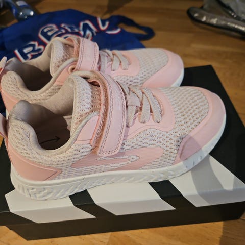 Joggesko for jenter i størrelse 32 og 33 med farger i rosa og lilla. Skoene har lys under sålene som lyser i forskjellige farger. Materialet ser ut til å være en kombinasjon av tekstil og syntetisk materiale. Skoene har borrelås og elastiske lisser for enkel på- og avkledning.