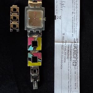 Swatch Dame/jente armbåndsur med svart rem og rund urskive med blå bakgrunn. Klokken har tydelige hvite tall og rosa visere og er fra slutten av 1990 tallet. Remmen er laget av plastmateriale med en rød spenne. Klokken er lite brukt og har minimal bruksslitasje. Egnet for daglig bruk.