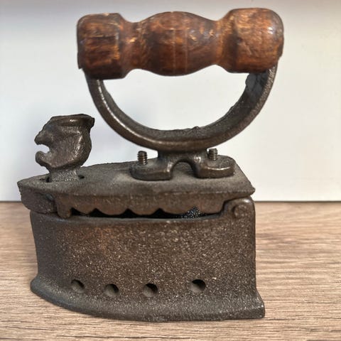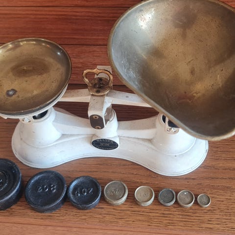 En gammel mekanisk vekt med to metallskåler for veiing. Vekten har en klassisk design og er laget av metall. Passer til dekorasjon eller som funksjonell vekt for mindre gjenstander.