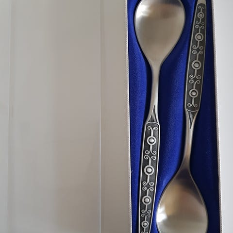 Salatbestikk i tinn fra Haugrud. Lengde 24 cm. Selges for kr. 150,-