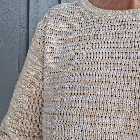 Dette er et dyrt (kr.430,- pr. hespe) luksusgarn! Selv om garnet er tynt og det er mye arbeid å strikke genseren, tar jeg her mindre betalt enn det garnet koster.