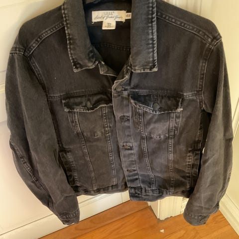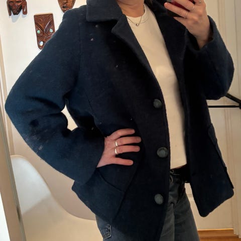 Svart overgangsjakke m/ militær preg. Gir Jane Birkin vibber. Gull metallknapper. Har byttet ut en av knappene med en knapp i tre. Helt svart, fargen kommer best fram på bilde nr3. Kul jakke til hverdagen 🖤Godt over knapper med nål og tråd, for å sikre at alt sitter. Selges som den er.