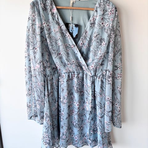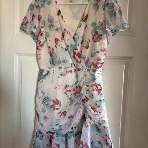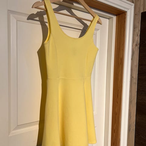 Nelly sommerkjole i størrelse 34. Kjolen har gul farge med mønster og er veldig stretchy i str. jeg er 160cm høy. Selges for 100kr.