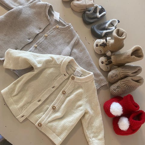 Strikkepakke til gutt. Alt i mykt godt garn. 3 gensere, 1 body, en lue, en rumpers. Pris pr stk eller 375 for alt.