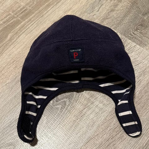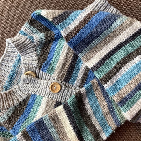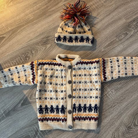 Hjemmestrikket jakke og to luer i str ca 2-4 år