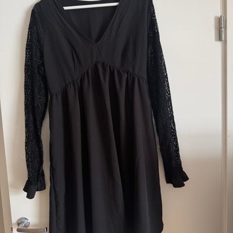 Svart kjole med fine hekledetaljer i hals og på ermer i str 44-46 selges for kr 150,-. Brukt kun 1 gang.