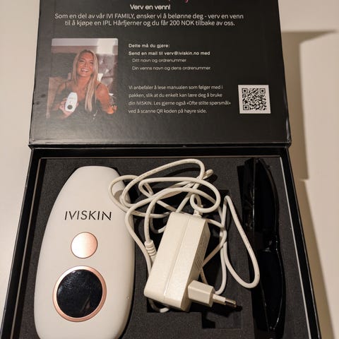 IVISKIN IPL hårfjerningsenhet i hvit og rosa farge. Enheten har digitalt display som viser antall pulser og kontrollknapper på siden. Leveres med strømforsyning og beskyttelsesbriller. Designet for hjemmebruk med fokus på hårfjerning.ca. 2 år gammel.