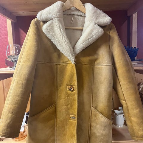 Selger en vintage semsket skinnjakke i størrelse S. laget i ekte skinn med belte i livet og klassiske detaljer. Jakken har den autentiske 70-tallsfølelsen mange er ute etter, og er laget i slitesterkt semsket skinn som fortsatt er mykt og pent.
