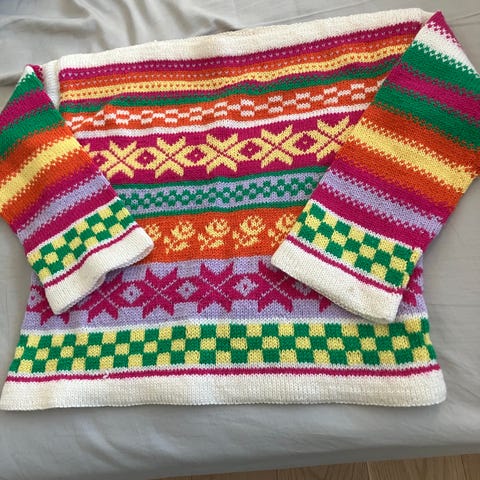 Jean Paul ullgenseri størrelse S for kvinner. Genseren er gul og har en strikket tekstur med mønsterdetaljer rundt halsen. Materialet er mykt og egnet for daglig bruk.