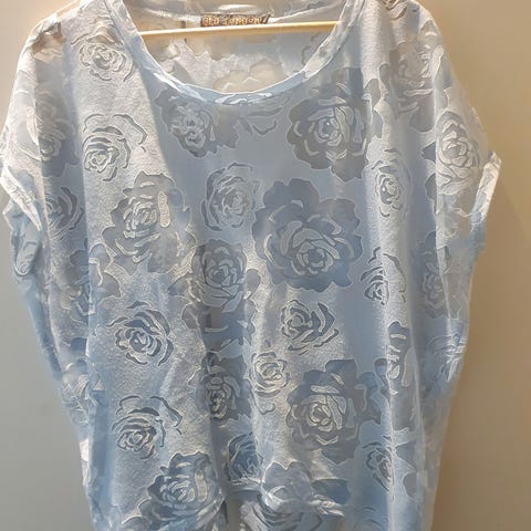 Gjennomsiktig topp i str S, med blomstermønster. Går fint å bare ha BH-under, synes ikke det blir for gjennomsiktig. Selges for 50kr.