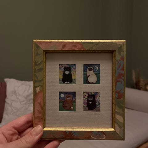 Disse er håndmalte trekattfigurer av kunstneren og designeren Laurel Burch (1945-2007). Hun var kjent for sine representasjoner av katter og andre dyr med livlige farger og intrikate mønstre. Disse figurene er et eksempel på hennes folkekunststil.