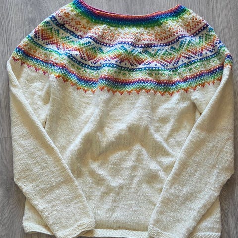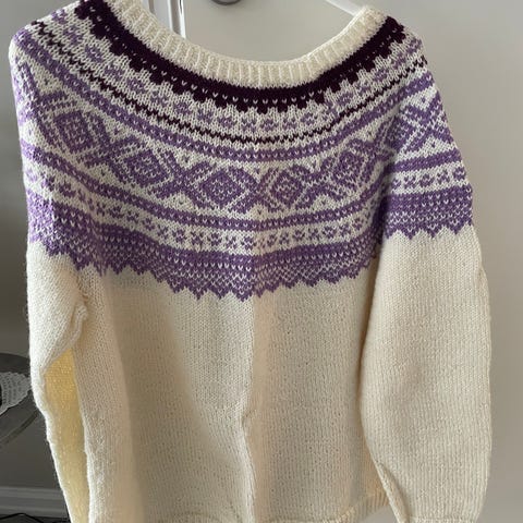 Kari Traa genser for dame i størrelse L med flerfarget mønster. Genseren er strikket med detaljer i flere farger rundt halsen og har rund hals. Materialet består av en blanding av ull og andre fibre