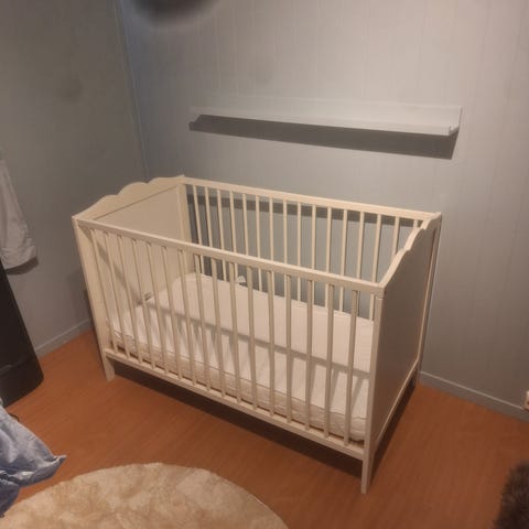 Var noen merker på kanten som er pusset og malt over, slik at den ble fin. Brukt av 2 barn. Kjøpt ny i 2021. Følger med madrass (Brukt tisselaken så den er fin) og et laken. :)