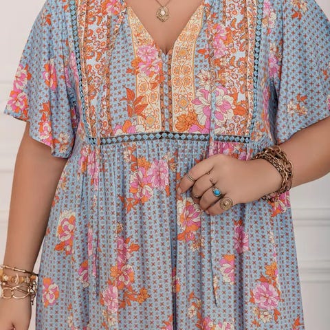 ByTiMo flerfarget kjole. Kjolen har broderte detaljer og voluminøse ermer, laget i lett materiale med knyting i midjen så kan nok passe strl både ned og opp.