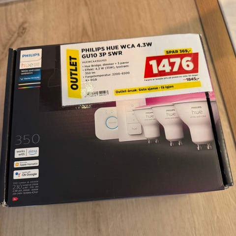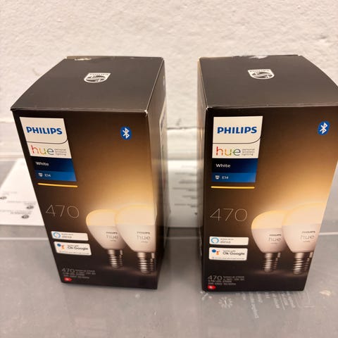 8 stykk nye og ubrukte Philips Hue Downlights. En av eskene er åpnet.