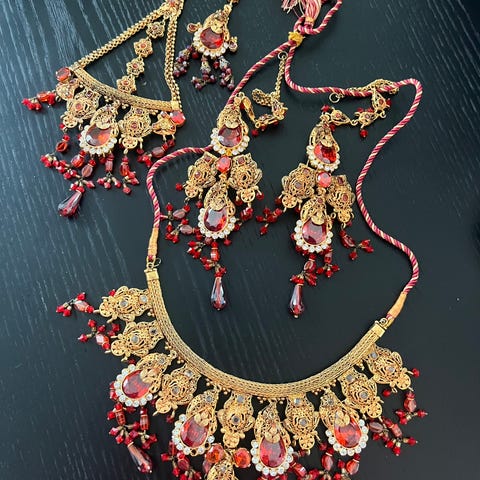 Selger et kjempestilig smykkesett bestående av kjede m anheng og matchende brosje.