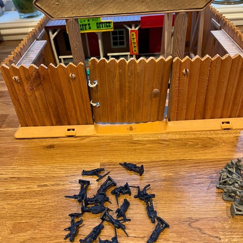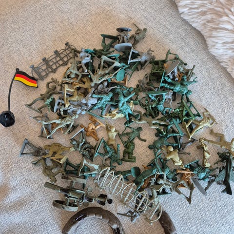 dette kule retro-lekesettet med soldater, en middelaldersk katapult og en militærhelikopter! Perfekt for barn som liker action- og rollelek, eller som nostalgisk samleobjekt. Settet inkluderer en blanding av grønne og grå soldaterfigurer i klassisk "Army Men"-stil, en funksjonell katapult med prosjektil, og en detaljert helikopter. Alt er i robust plast og passer for kreativ lek – se bildene for oversikt.