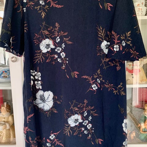 Kjolen har kort erme og rund hals med åpning og knapp bak. Kjolen faller pent og har et behagelig snitt. Lengde til kne. Selges for kr. 150,-