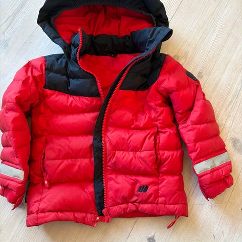 Fuskepels rundt hetta og fleece på innsiden av hetta. 100% dun. Medium tykk, men er passe lett i vekta. Kan passe fra ca 1.5 år og opp til ca 2.5 år.