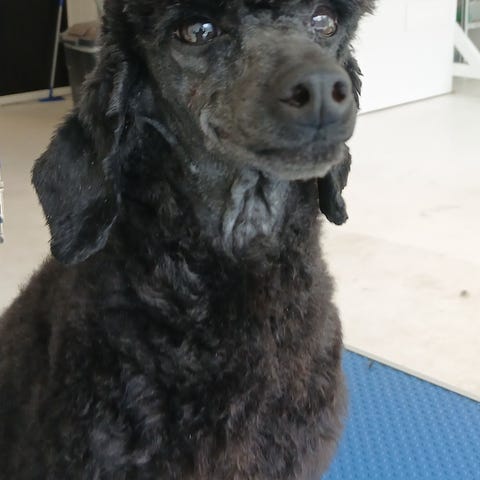 Hun sitter/ligger fint ved klipping. Jeg har klipt selv til nå, men har også benyttet meg av hundefrisør å hun er like flink der☺