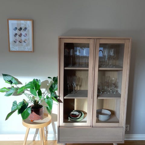 Stilrent vitrineskap i laminert eik