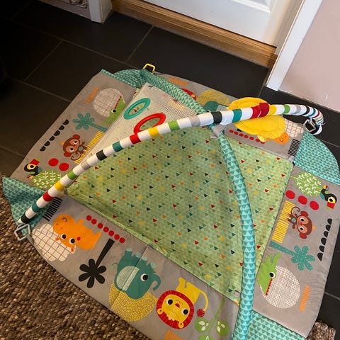 Babygym fra baby Einstein med fargerike tekstiler og myke leker inkludert. Babygymmen har en buet konstruksjon med flere leker som kan henges opp, samt et lite speil for visuell stimulering. Det mangler et par leker som hører til, men man kan henge hva man måtte ønske, så lenge de har en lignende ring som de andre lekene. Speilet er noe oppripet (se bilde). Sola som skal henge i toppen i midten lager musikk på repeat og er genial underholdning for babyen. Kan legges sammen og tar lite plass om man ønsker (se bilde). Lett å flytte rundt omkring.