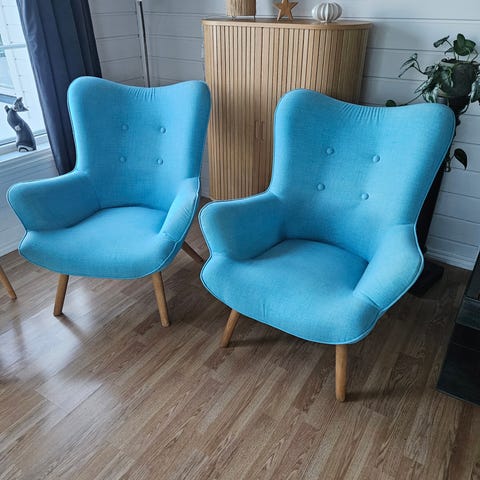 Pent brukt lys blå lenestol, nettopp vasket.