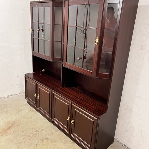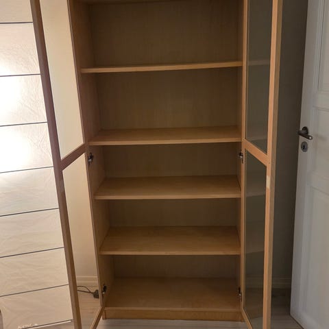Mørk reol med glass dører gies bort. I pen stand. Må hentes.