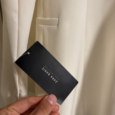 Hvit blazer fra Reserved i str 36, som ny, bare brukt få ganger. Jakken har en enkel design med langt erme og er laget i et materiale som gir en glatt overflate. Passer til formelle og uformelle anledninger, bryllup, så vel som fester.