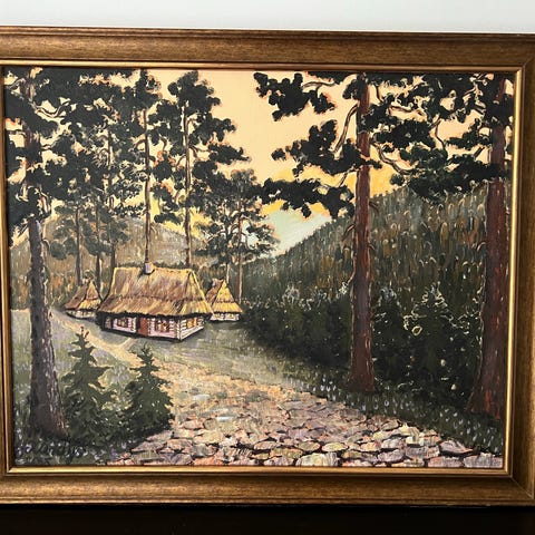 Signert oljemaleri fra 1953 som forestiller et landskap med steiner, trær og vann. Maleriet er innrammet i en dekorativ ramme med detaljerte utskjæringer. Fargene er naturlige og bildet viser et rolig naturområde. Fargerike, optymisk, olje på plate.