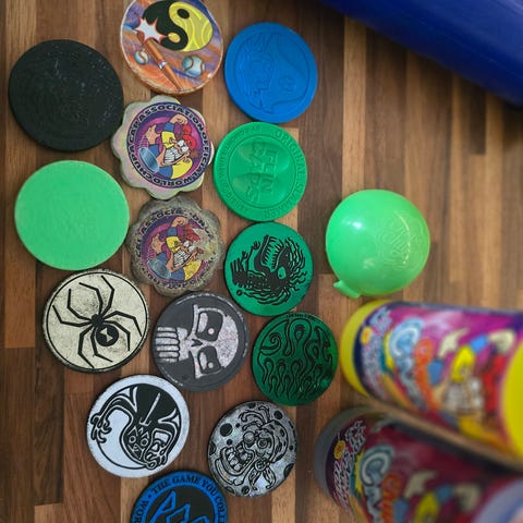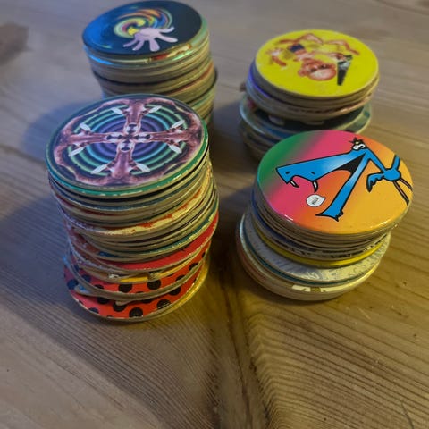 Selger barndomssamlingen av pogs. Det meste er blank-backed, med noe unntak: