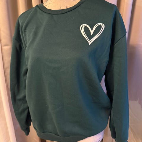 Selger en beige genser med et lite hvitt hjerte på brystet.