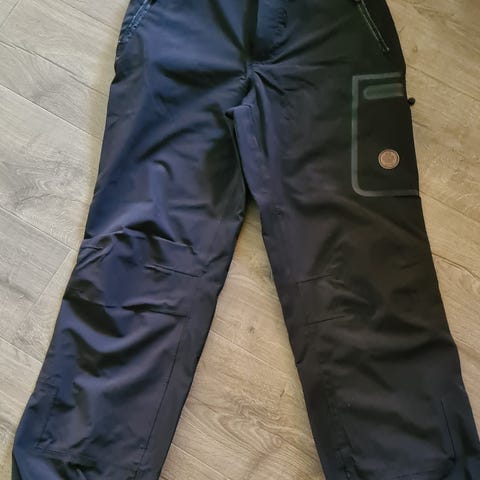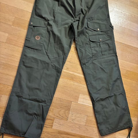 Gaupa bukse 38, laget av bomullsmateriale. Buksa har svart og grå farge med forsterkede områder på knær og lommer. Designet for praktisk bruk med flere lommer og slitesterk konstruksjon.
