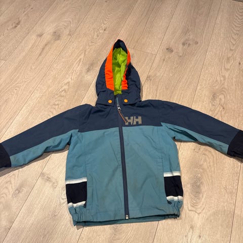 Helly Hansen skalljakke i størrelse 110. Jakken har fargene blå og gul og inkluderer avtagbar hette.