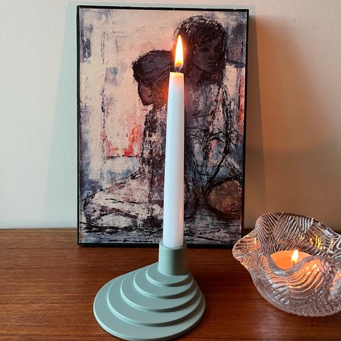 Selger en blå lysestake. Medfølger ett blått kronelys og to rosa kronelys.