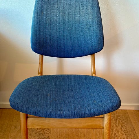 Klassisk utforming med trukket sete. Stolene er stabile og i pen brukt stand. Selges samlet.
