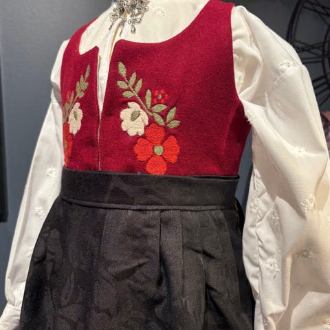 Selger denne fantastiske svarte festdrakt i størrelse 116 / 6 år. Svart ullblanding med blomster. Inkludert drakt, skjorte, kappe og veske. Pent brukt og nylig vasket. Kan hentes i Oslo eller sendes.