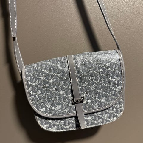 Goyard skulderveske i grå lær, designet for unisex bruk. Vesken har glidelås på toppen og to skulderstropper. Materialet er slitesterkt lær med et karakteristisk mønster. Passer til daglig bruk og kan romme personlige eiendeler. har god plass. Mye bruk igjen.