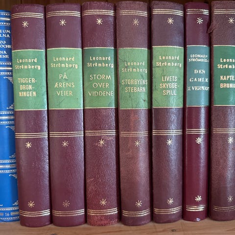 boksett bestående av tre bind i burgunder rødt skinn. Hver bok har gullpreget tekst på ryggen. Passer for samlere eller som dekorativ bokserie.
