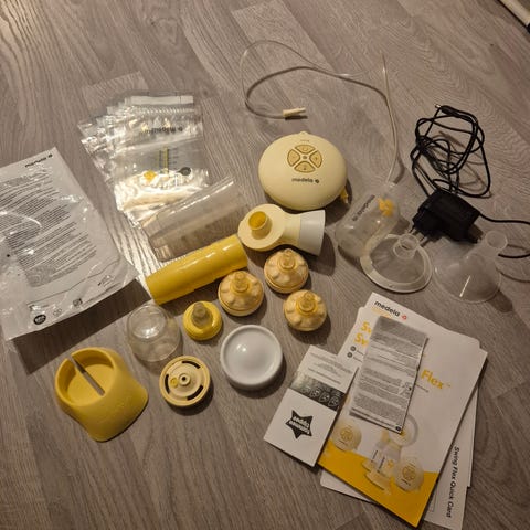 -Jeg selger Medela Freestyle Flex elektrisk brystpumpe komplett med flere tilbehørskomponenter inkludert flasker, flaskesmokk, slanger, oppbevaringsposer 25 stk og en kjølebag. Følger med pumpe-bustier i hvit str M. Kr 1750
