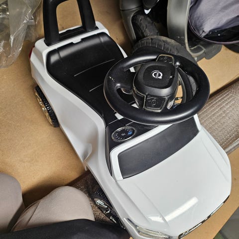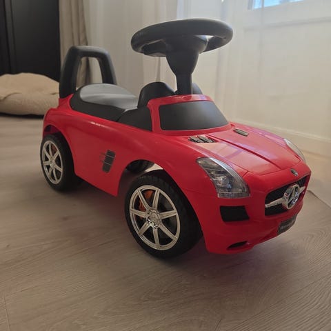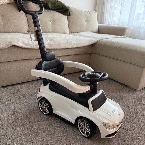 Mercedes gå bil med hornlyd og musikk, og «bagasjeplass» under sete. Kjøpt på thansen før sommeren i år (2025) blitt brukt av tvilling jenter fra 18 måneder til de nå er blitt 2 år.