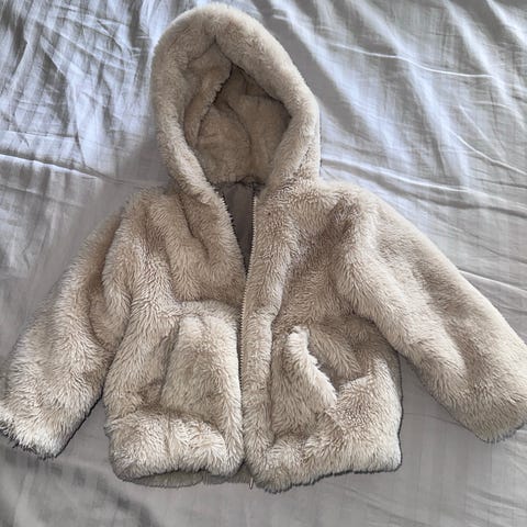 Zara jakke i størrelse 98 for jenter. Jakken er beige og har en myk, pelslignende fôr på innsiden for ekstra varme. Den har hette og lukkes med glidelås og knapper. Passer til barn i denne størrelsen og kjønn.