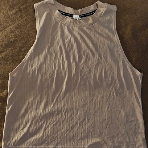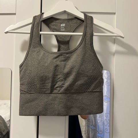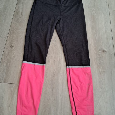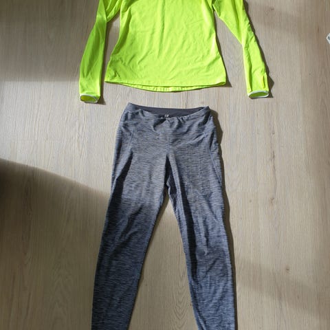 H&M Sport treningsklær for kvinner i størrelse M. Settet inkluderer en topp og tights, egnet for fitnessaktiviteter. Materialet er tilpasset sport og trening.