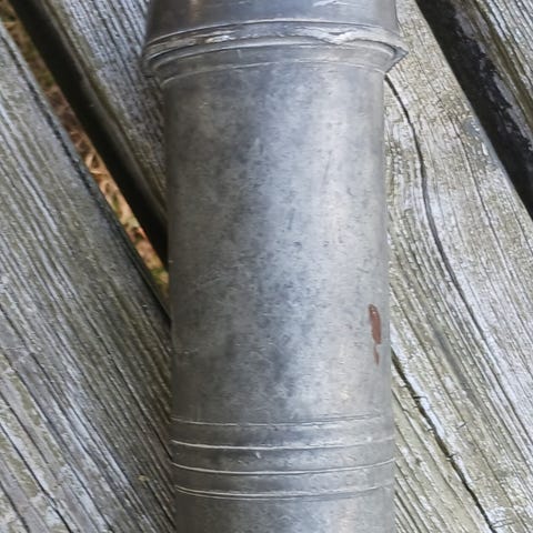 Stort tinnfat med flott mønster banket inn. 45 cm diameter. Ser håndlaget ut. Er laget opphengsfunksjon på baksiden.