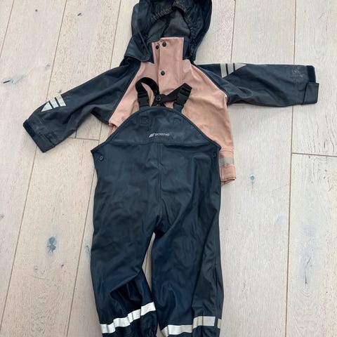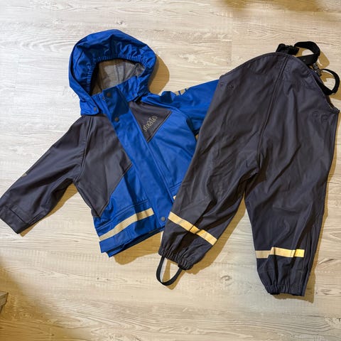 Regnsett er godt vasket med fille og såpe (ikke kjørt i vaskemaskin da jeg mener her helt unødvendig). Smuss er synlig, gikk ikke bort etter vask.