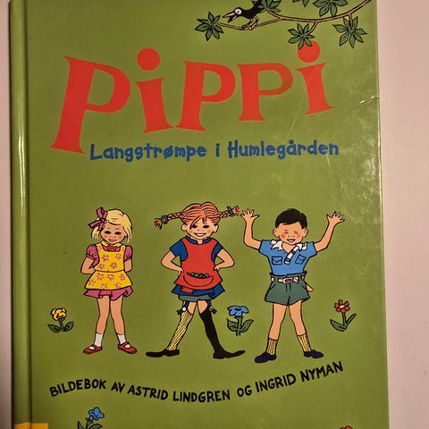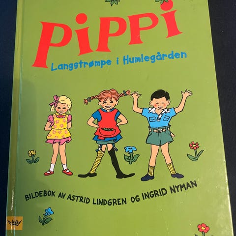 Pippi Langstrømpe barnebok med fargeillustrasjoner av Astrid Lindgren og Ingrid Nyman. Boken inneholder historier om Pippi Langstrømpe og hennes eventyr i Humlegården.