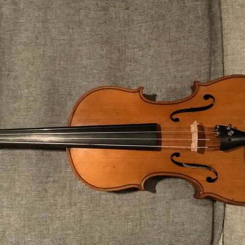 Selger en fin, pent brukt tysk fiolin, modellert etter Stradivarius. Instrumentet er sannsynligvis laget tidlig på 1900-tallet, og har den klassiske varme klangen disse tyske kopiene er kjent for.